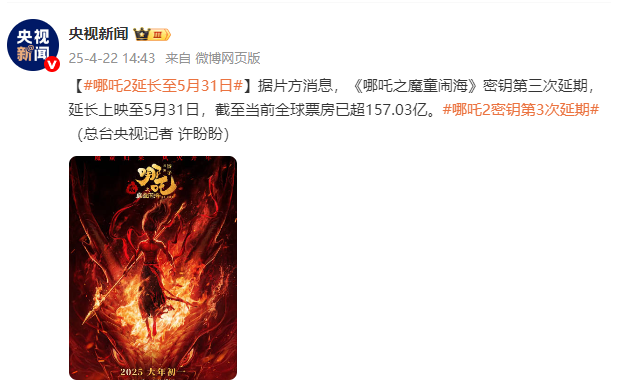 据片方消息,《哪吒之魔童闹海》密钥第三次延期,延长上映至5月31日,截至当前全球票房已超157.03亿。(总台央视记者 许盼盼)